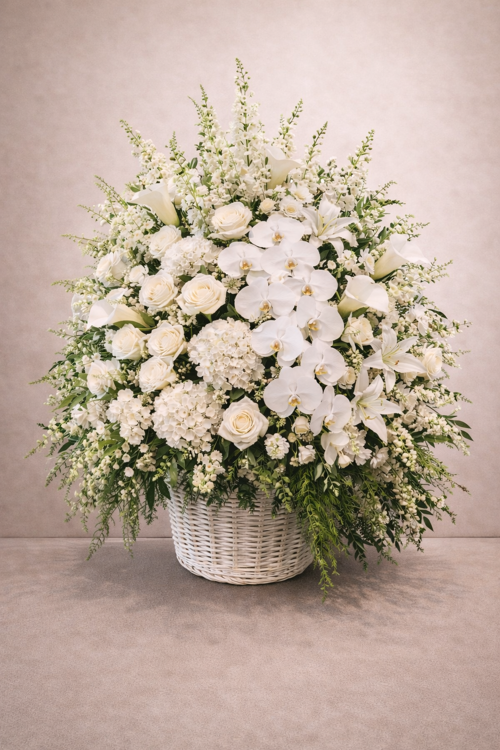An opulent expression of sympathy, The Solennne Grand Floor Tribute is composed with premium white roses, cascading phalaenopsis orchids, sculptural calla lilies, hydrangeas, and seasonal garden blooms.