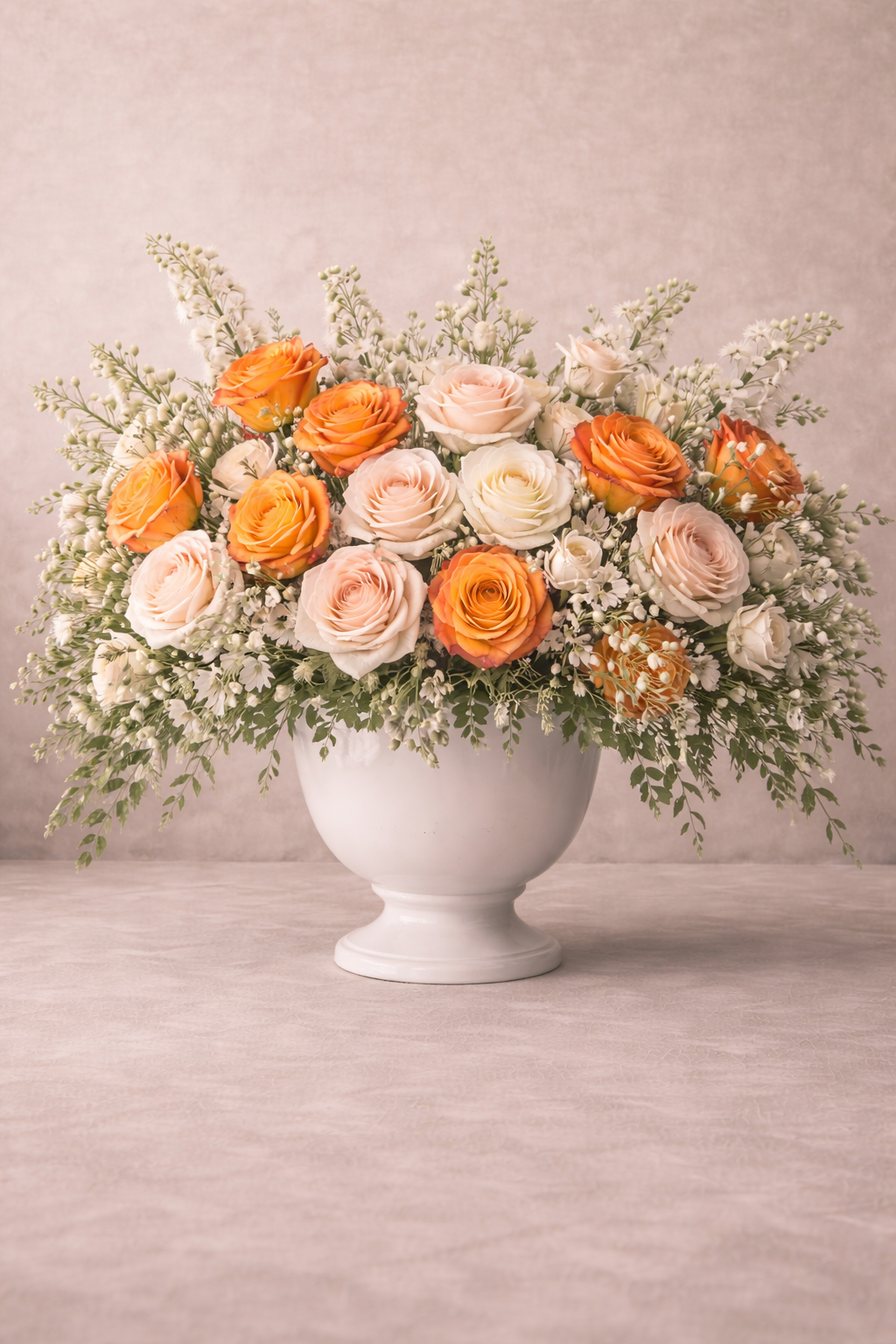 The Maison Garden is a refined, European-inspired statement arrangement designed with layered ivory roses, soft champagne blooms, lush seasonal greens, and subtle accents of warm orange garden roses. The balance of neutral elegance with a whisper of color creates a sophisticated yet vibrant presence — perfect for luxury residences, memorial services, or elevated gifting.