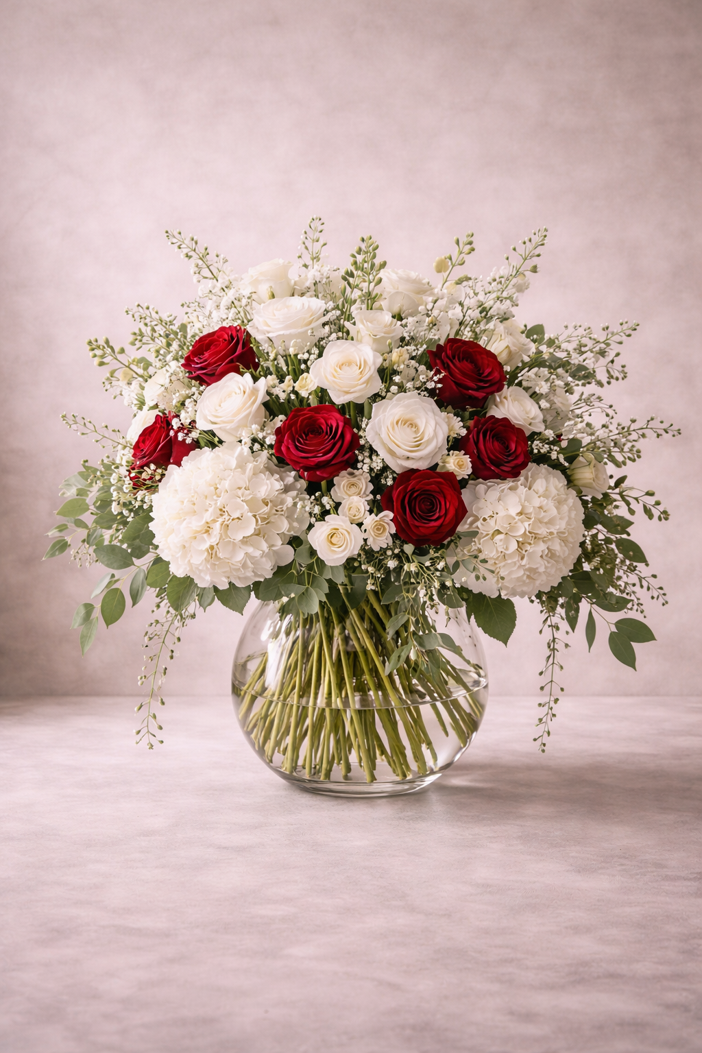 architectural ivory composition designed for refined interiors and formal occasions. White roses, hydrangea, lisianthus, stock, and seasonal textural greens rise in a structured yet fluid silhouette inside a clear glass cylinder vase. Clean. Polished. Timeless.