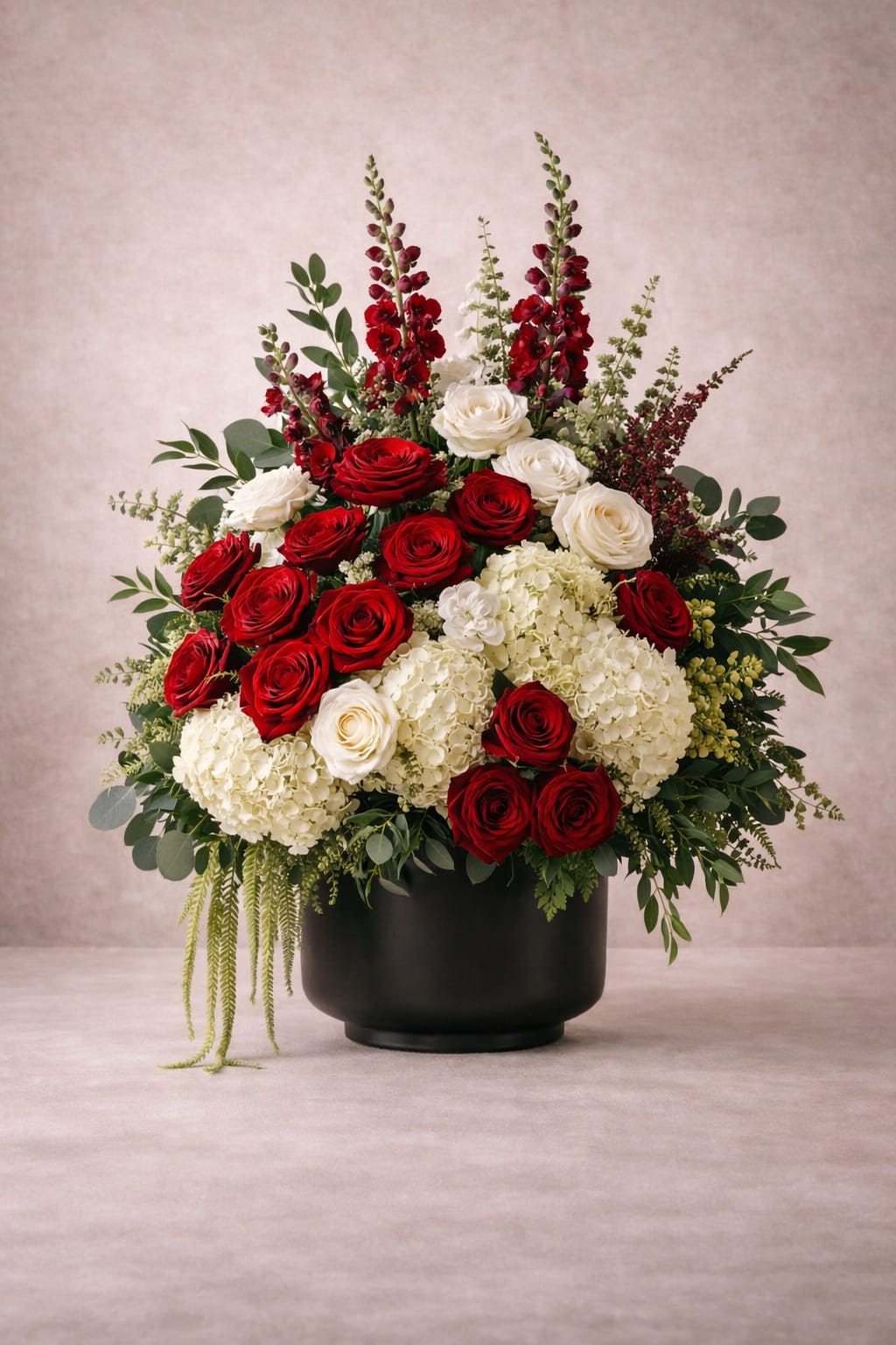 Velvety deep red roses are layered among premium ivory hydrangeas and garden roses, elevated with textural greenery and refined structural movement. Designed in a matte black architectural vessel, this piece commands attention while maintaining elegance and restraint.