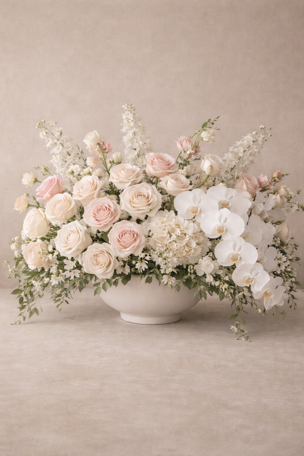 A commanding composition of layered white roses, phalaenopsis orchids, reflexed tulips, and textured hydrangea arranged in a sculptural low silhouette. Designed with precision and restraint, The Valmont Blanc embodies modern European luxury — bold in presence, flawless in execution.